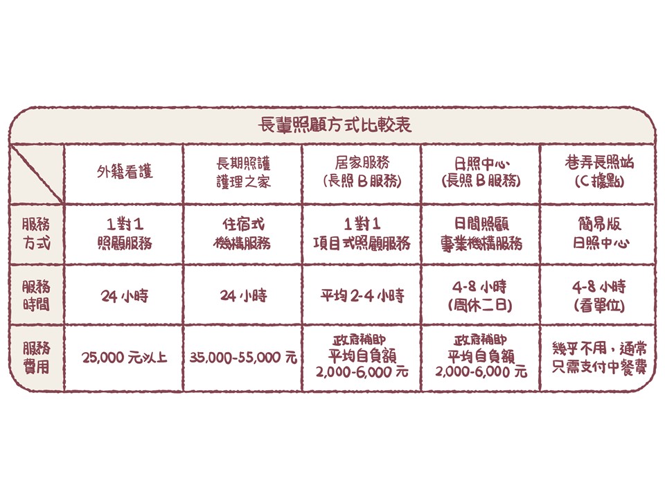 --- 照顧長輩是一個選擇題,如何增加以及了解選項, 在我們遇到問題時就可以選擇最適合的照顧方式。 --- 照顧長輩常見的幾個做法,喜大人再分別從服務方式、時間與費用,一次整理給你!我們希望可以帶動大家多做一點點的事,像是分享長照資訊給周遭的朋友,相信就可以緩慢但扎實地改變照顧者在照顧長輩上的困境。